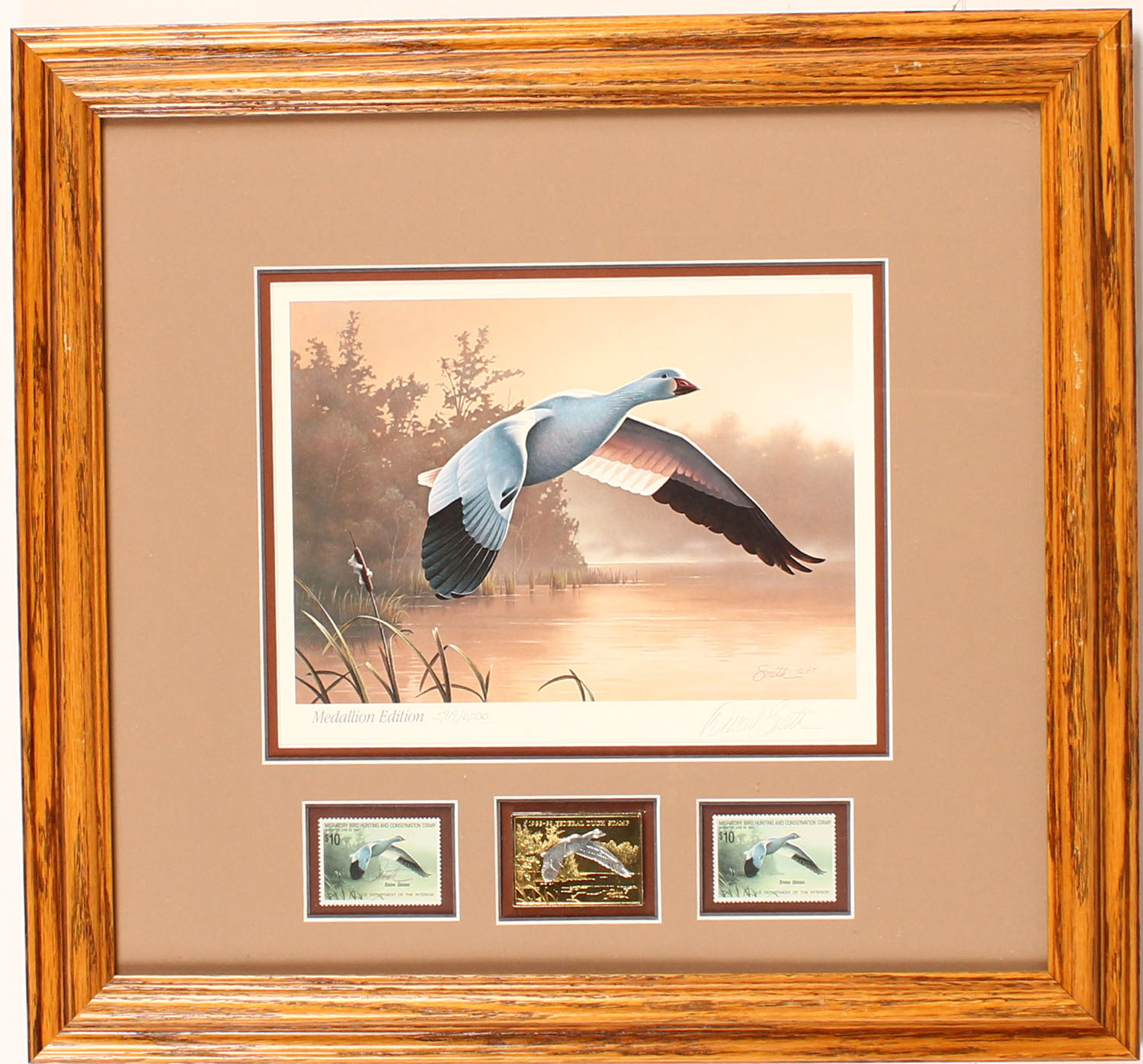 1988 Federal Duck Stamp Medallion Edition Print, 5919/6500, has two unsigned stamps with gold & silver medallion, pictures show goose at sunrise by David Smith, 9'' x 6 1/2'' framed & matted. Grade: MINT - Value: 10 to 150
