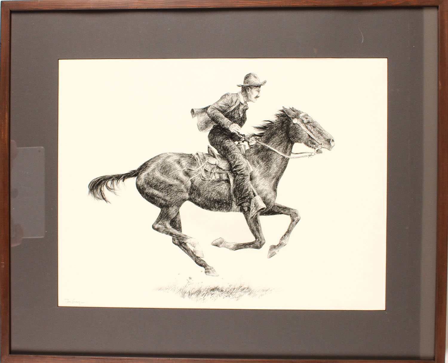 Don Gray charcoal pencil drawing of man on horseback, 24'' x 18'' image size, framed & matted. Original rendering was for illustrating the limited edition Rendezvous book. Grade: Excellent ++ - Value: 10 to 200