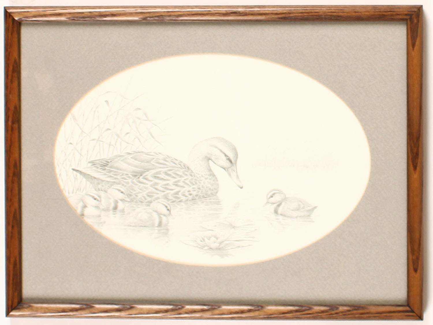 Print of mallard hen with here new born ducklings, 12'' x 8'' image size, framed & matted. Grade: Excellent - Value: 2 to 100