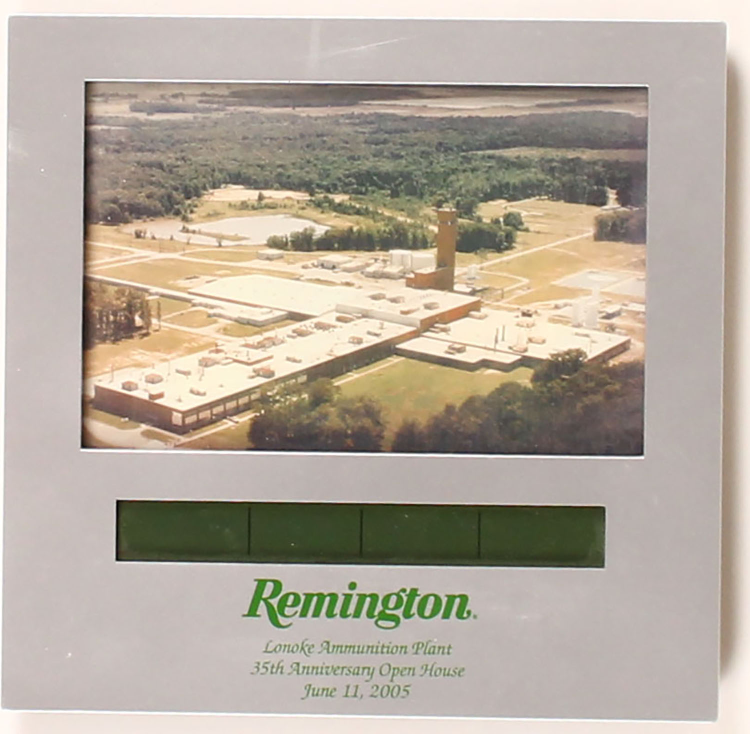 Remington Lonoke Ammunition Plant photo with easel back for desk, also has battery powered time, date & temp, 7 1/2'' sq. Grade: MINT - Value: 2 to 50