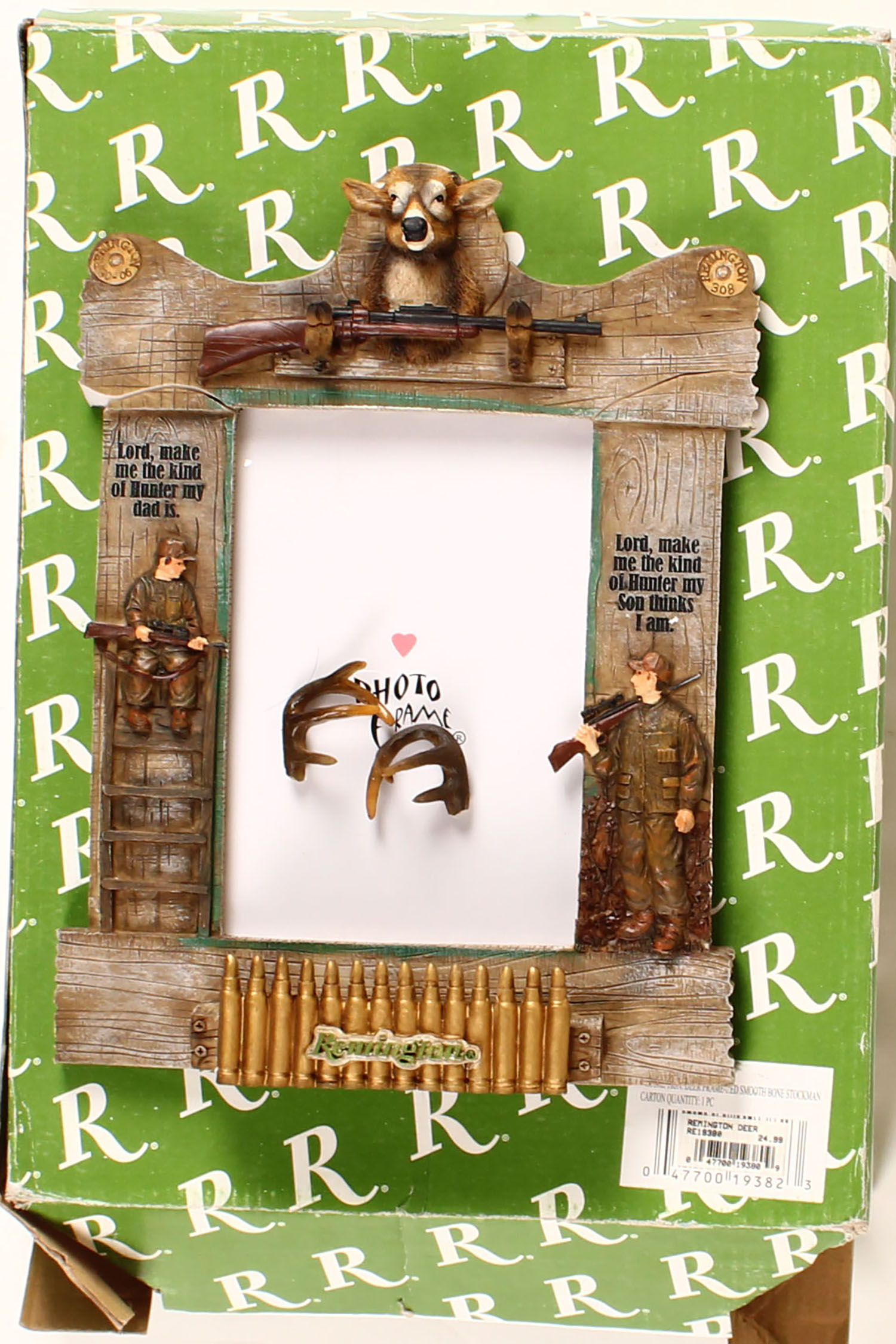 Remington Picture frame 3D with deer head, guns & ammo, 5'' x 6'', antlers are broken off but could be reglued and frame around picture is cracked. Grade: Very Good - Value: 2 to 50