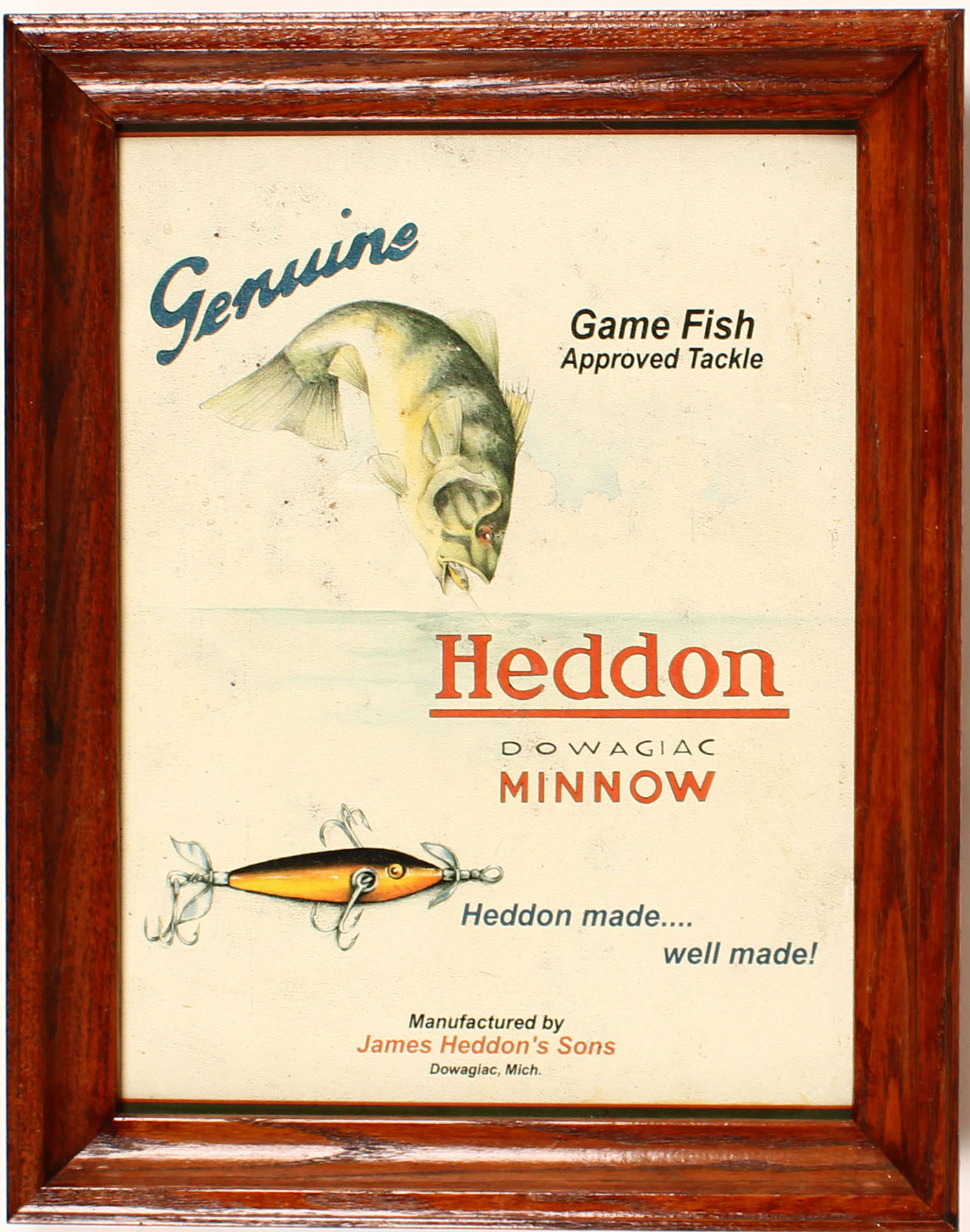 Heddon Dowagiac Minnow metal sign, framed, 12'' x 16''. Grade: Excellent - Value: 2 to 50