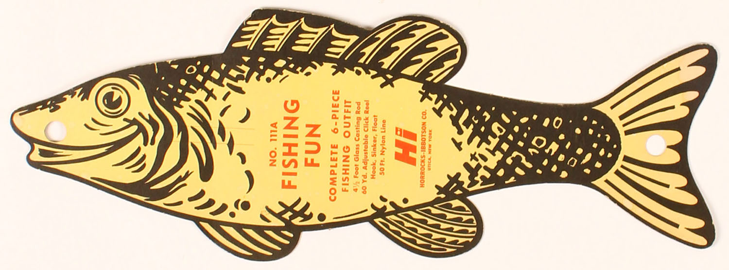 Horrocks-Ibbotson Co. fish shaped advertisement, thin cardboard, No. 111A Fishing Fun, 17'' long. Grade: Excellent - Value: 10 to 100