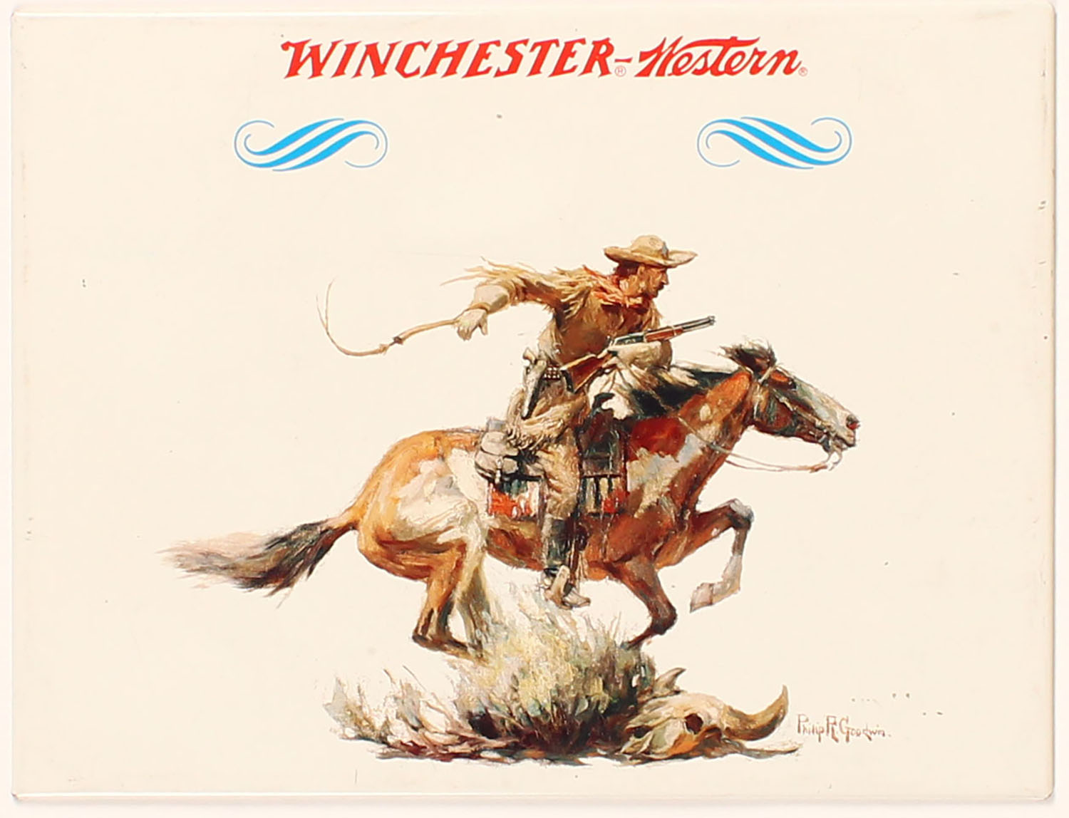 Winchester-Western metal sign with cardboard back, by Phillip R. Goodwin, 12'' x 9''. Grade: Excellent + - Value: 20 to 100