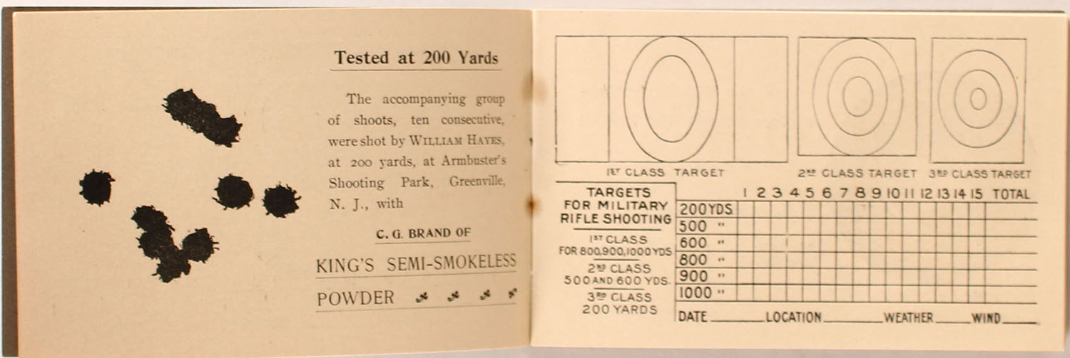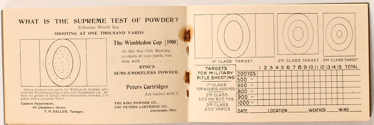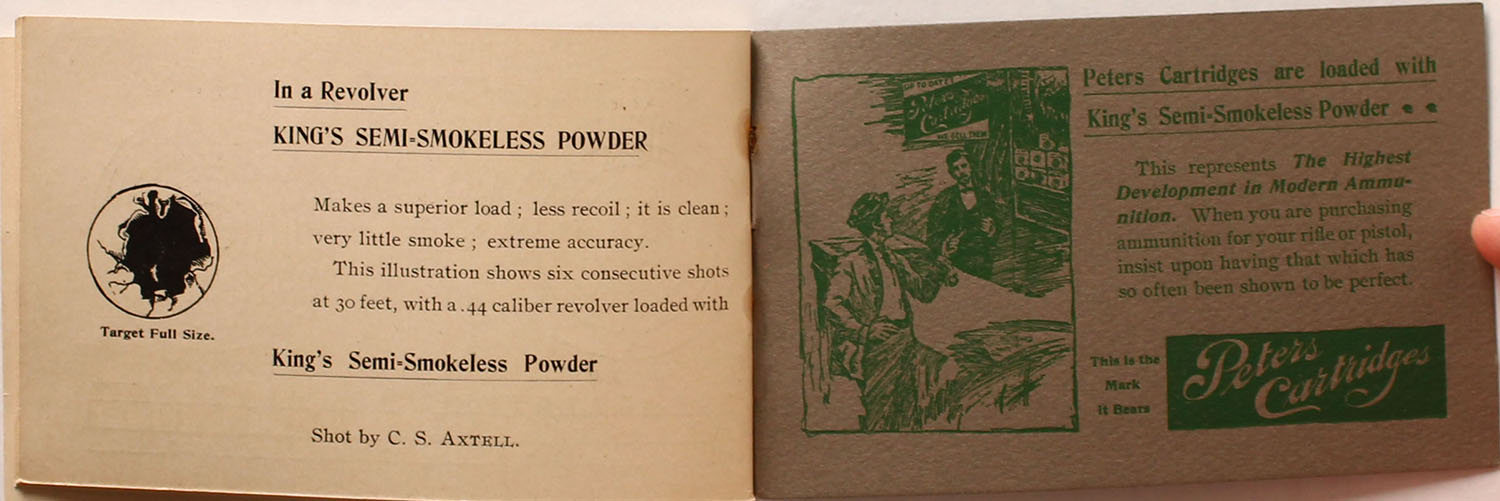 Peters Cart. Co. & The King Powder Co. Rifleman's Record and Score Book, about 26 pages, 5 1/4'' x 3 1/4''. Grade: Excellent - Value: 6 to 50