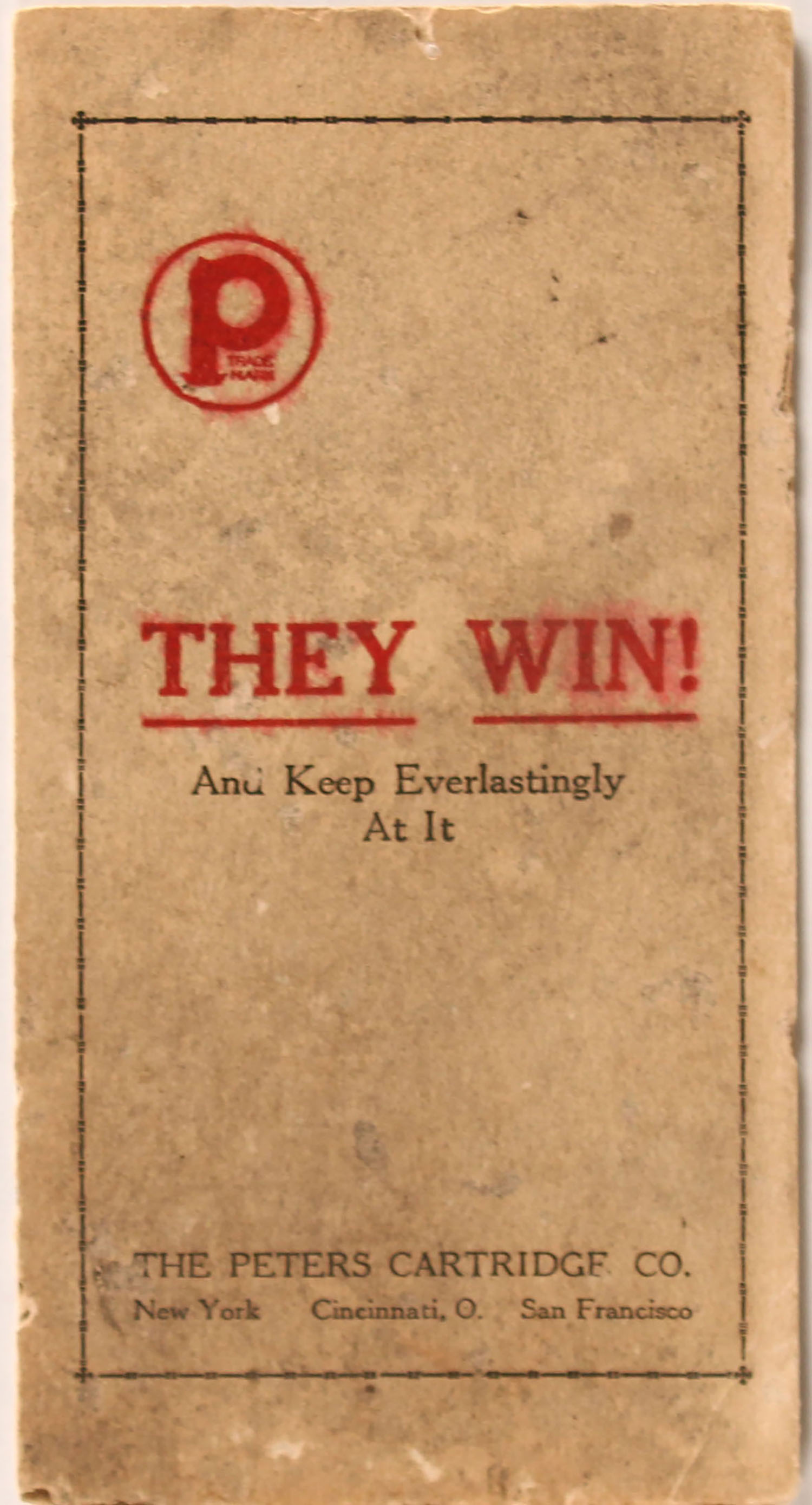1920 The Peters Cart. Co. fold out brochure, THEY WIN!, list all shooting titles won by Peters, one end has separated. Grade: Good ++ - Value: 2 to 50