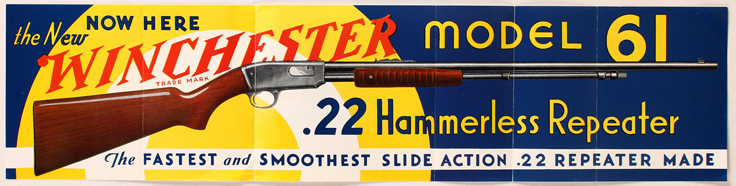 Winchester NEW Model 61 poster, .22 Hammerless Repeater, 21'' x 5'', has fantastic colors, has a few fold marks. Grade: Excellent - Value: 30 to 1000