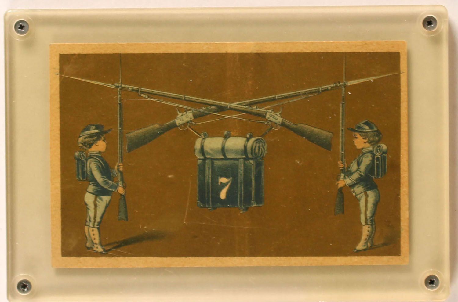 Postcard marked The 9th Company Table Seventh Regiment Fair, pictures two young boys dressed a soldiers with guns & a gold leaf background. Grade: Excellent - Value: 10 to 50