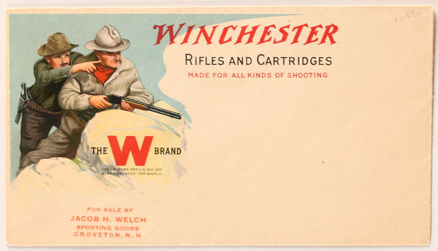 Winchester Envelope with advertising, wonderful full color image of two men looking over a rock and big game, wonderful red, blue and black print on back, has small tear to back, Unused, very bright and clean!! Grade: Excellent - Value: 50 to 200