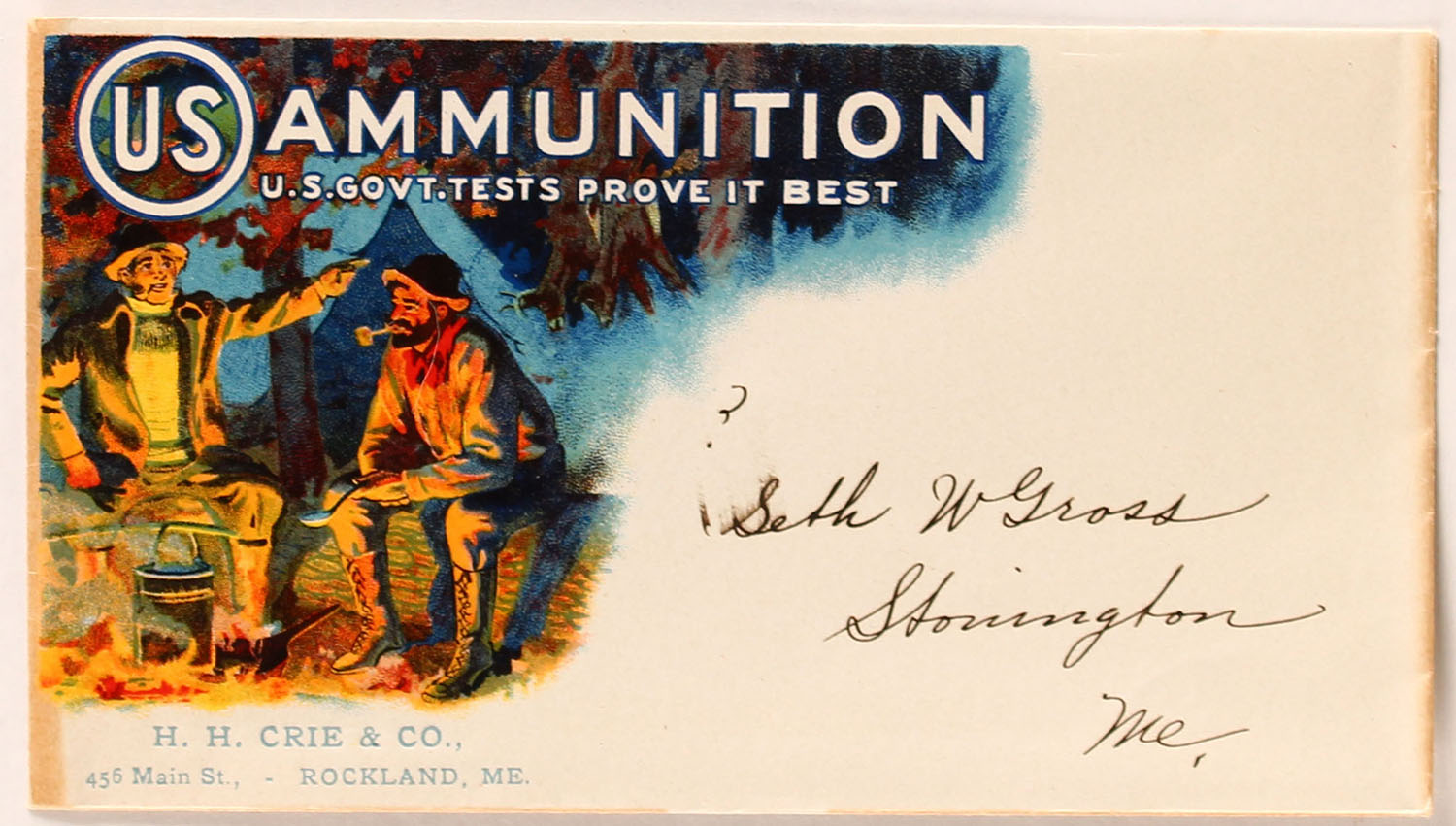 US Ammunition envelope unused, has great full color image of two hunters in camp. Grade: MINT - Value: 30 to 150