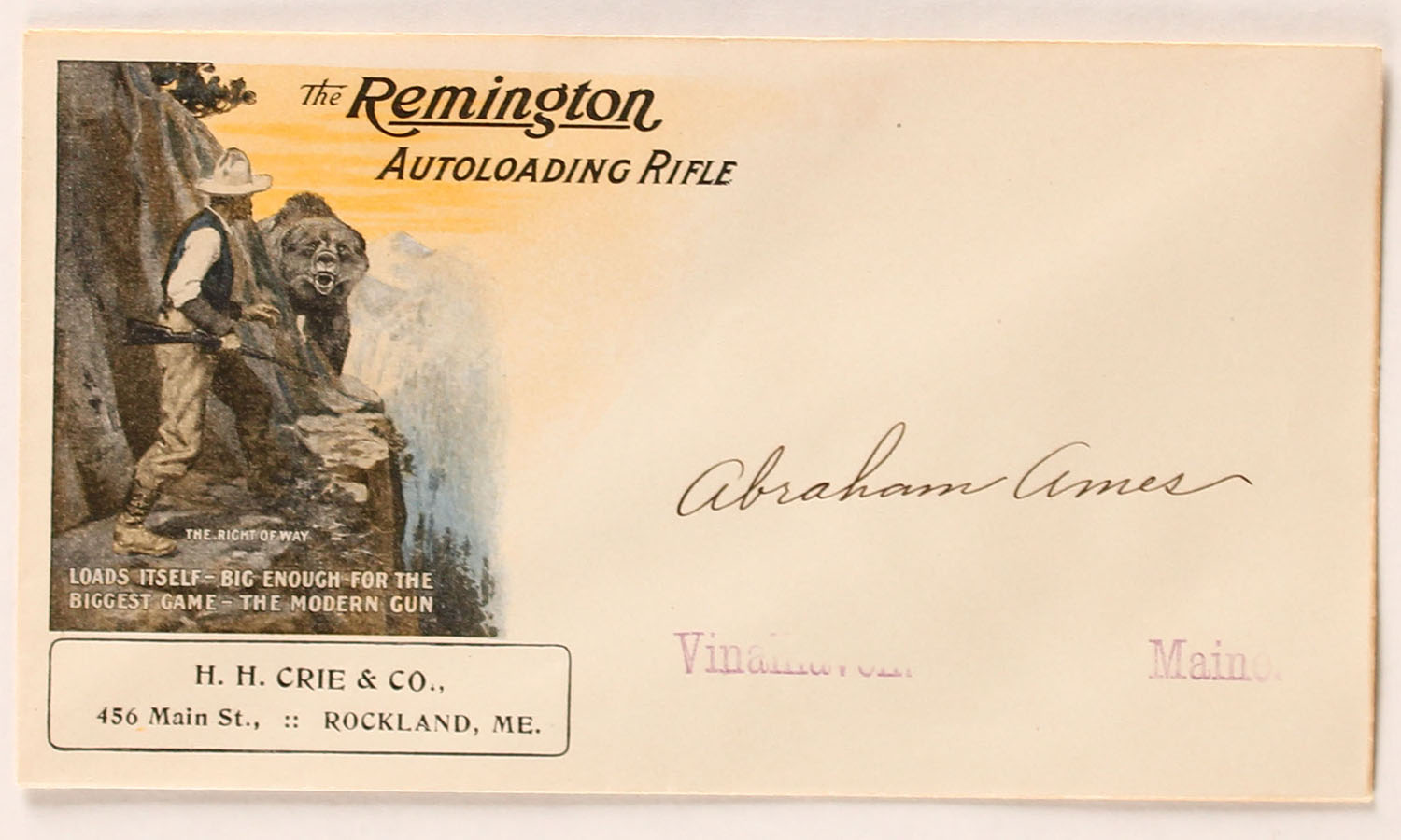 Remington Autoloading Rifle Envelope with advertising, wonderful full color image of Grizzley bear on attack on cliffs edge, images of guns & ammo on back, Unused, very bright and clean!! Grade: Excellent ++ - Value: 50 to 250