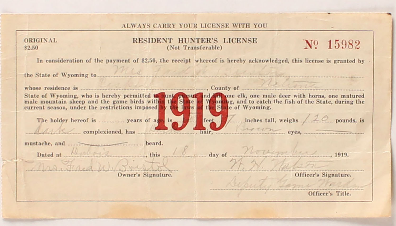 1919 Wyoming hunting license, quite rare since there were few people living in Wyoming at that time. Grade: Excellent - Value: 10 to 100
