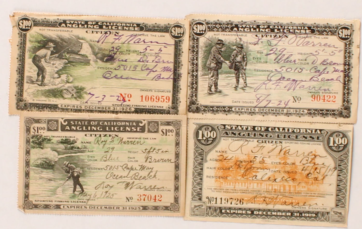 Lot of 4 California Fishing Licenses, 1919, 1924, 1925 & 1926. Grade: Very Good ++ - Value: 50 to 300