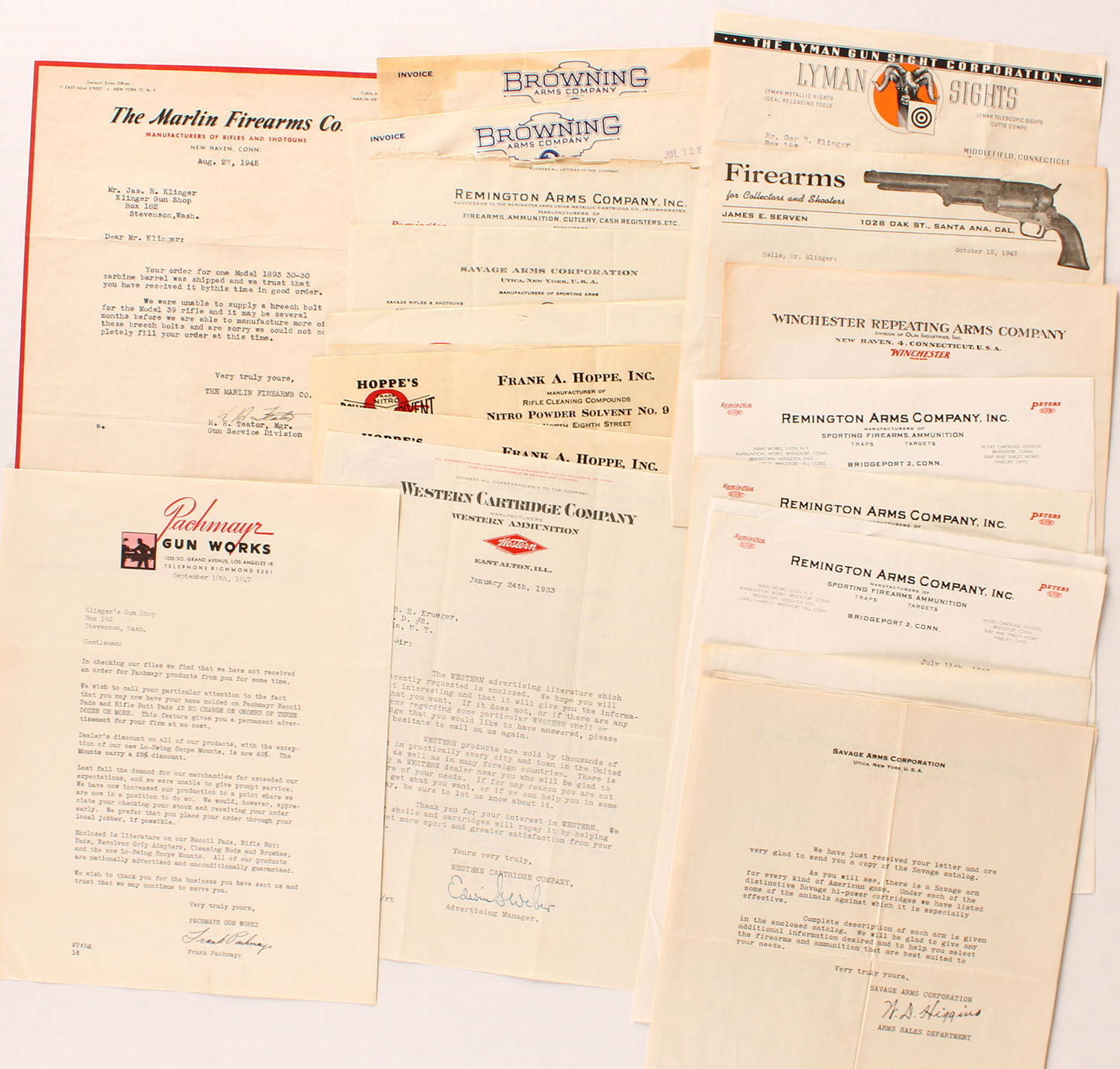 Lot of 22 letters, etc., from gun companies, all from 1949 & earlier. Graded: Excellent - Value: 6 to 30