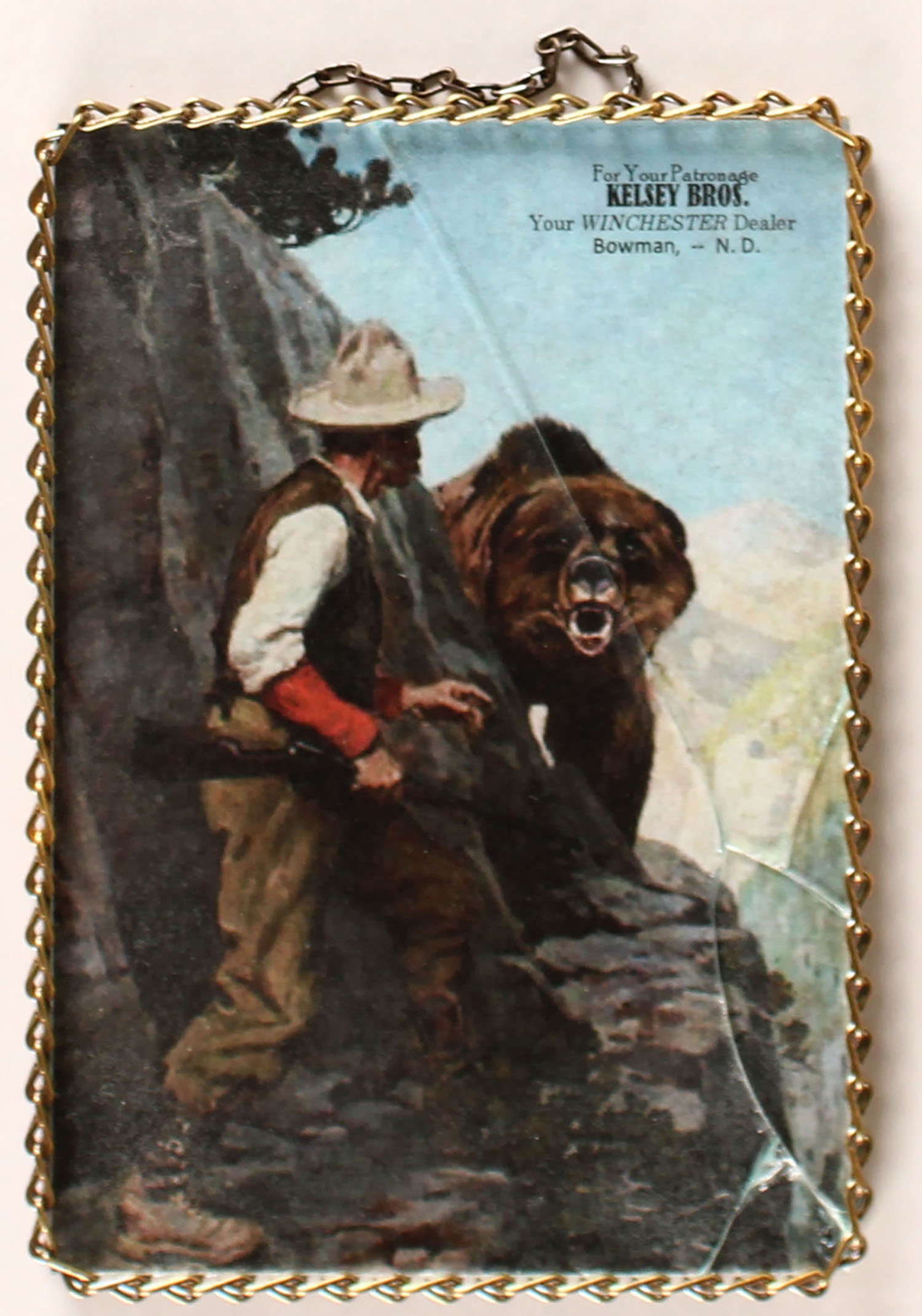 Winchester Chain Art pictures hunter on cliffs edge with a grizzly bear on the attack, glass is broken, 7'' x 5''. Grade: Good ++ - Value: 30 to 150