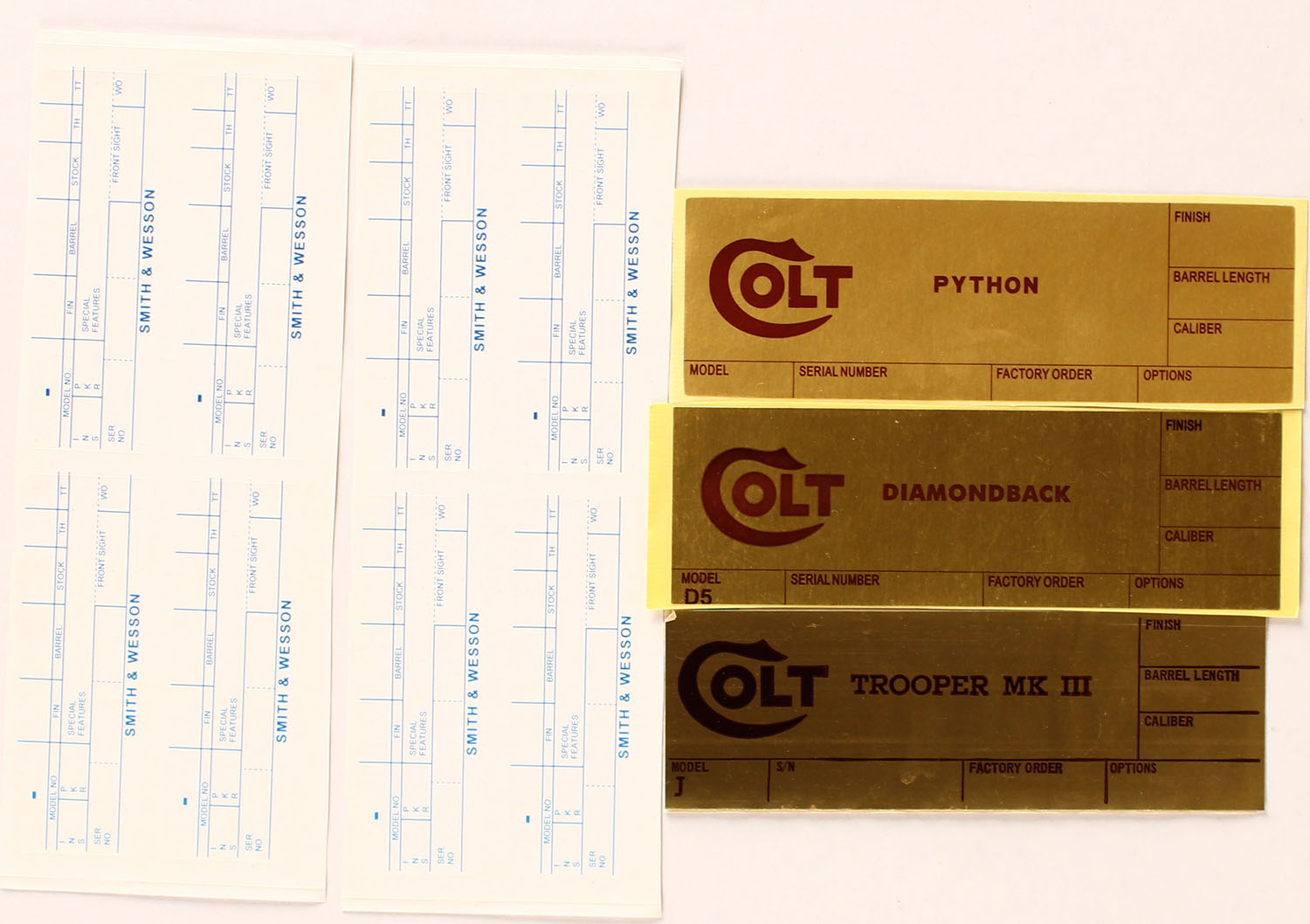 Set of Colt & S&W end labels for pistols. Grade: MINT - Value: 2 to 40