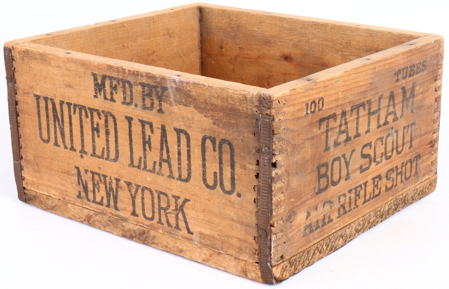 National lead Co. Tatham BOY SCOUT Air Rifle Shot wood shipping crate, print and crate is bright and clean. Grade: Excellent - Value: 50 to 100