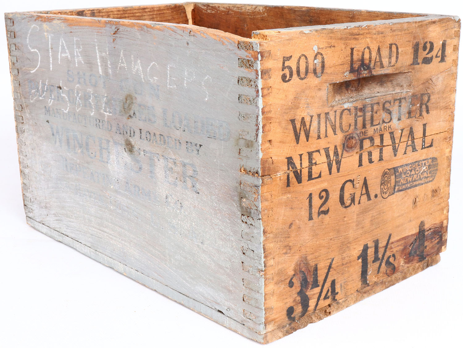 EARLY! Winchester, NEW RIVAL, 12 Ga., tongue and groove construction, red, & black 3 1/4 - 1 1/8 - 4, print is solid and crate has 3 sides painted. Grade: Good - Value: 6 to 40