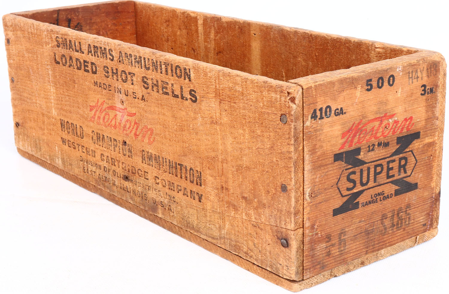 Western Super-X, 410 Ga., 3'', 6 Ch., nail construction wood shipping crate, black & red print is solid, and the crate has some age soiling. Grade: Very Good - Value: 20 to 80