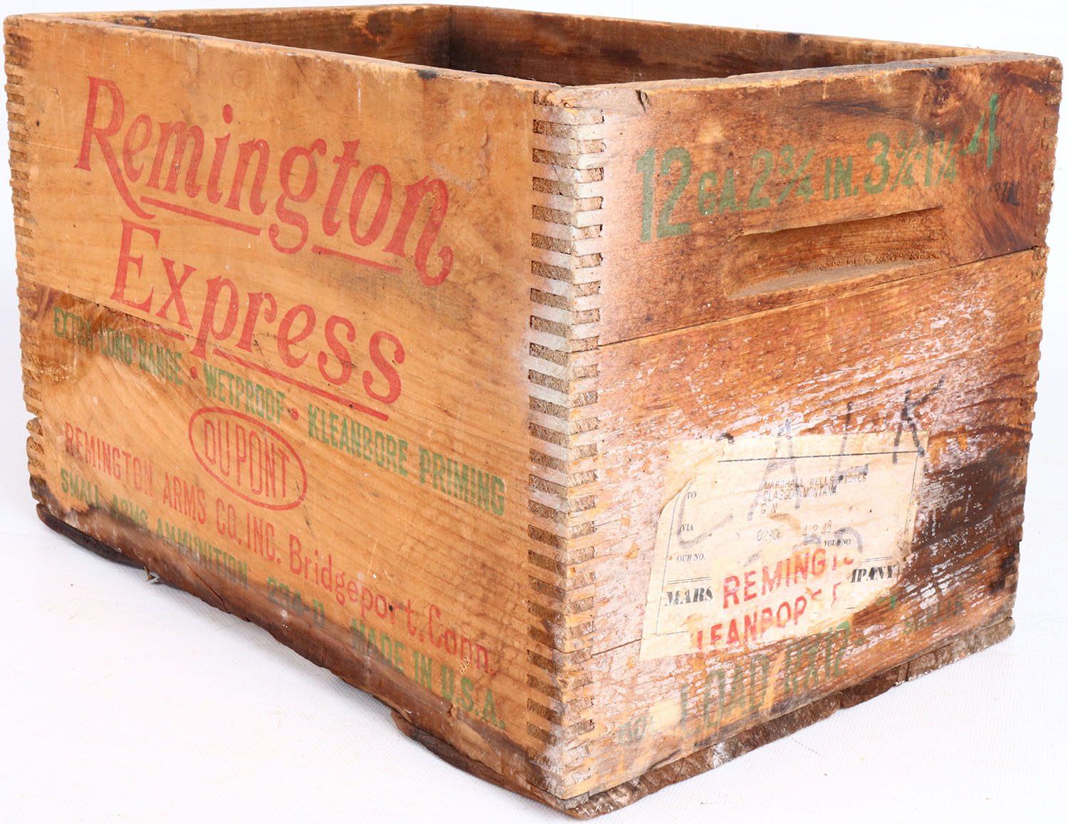 Remington Express, 12 Ga., 4 shot, tongue and groove construction, red, & green print have some fading and crate has age soiling. Grade: Very Good - Value: 2 to 30