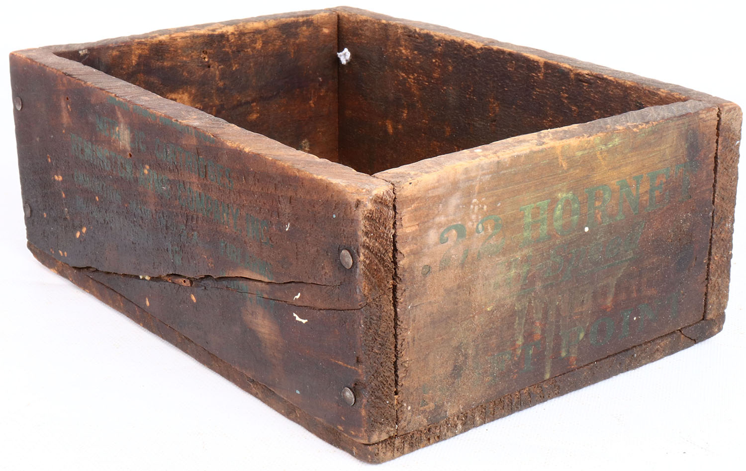 Remington 22 Hornet, nail construction, red, & green print is faded, crate has heavy age soiling. Grade: Good - Value: 2 to 40