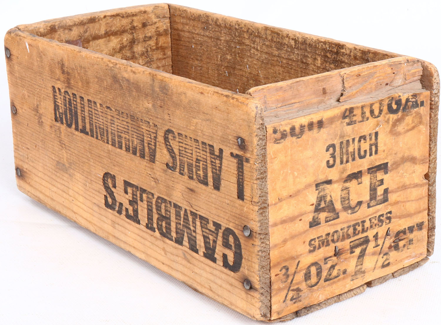 Gambles Ace, wood shipping crate, .410 ga. 7 1/2 ch. shot., nail construction, black print is solid and crate has scuffing and scraps to wood. Grade: Very Good - Value: 2 to 60