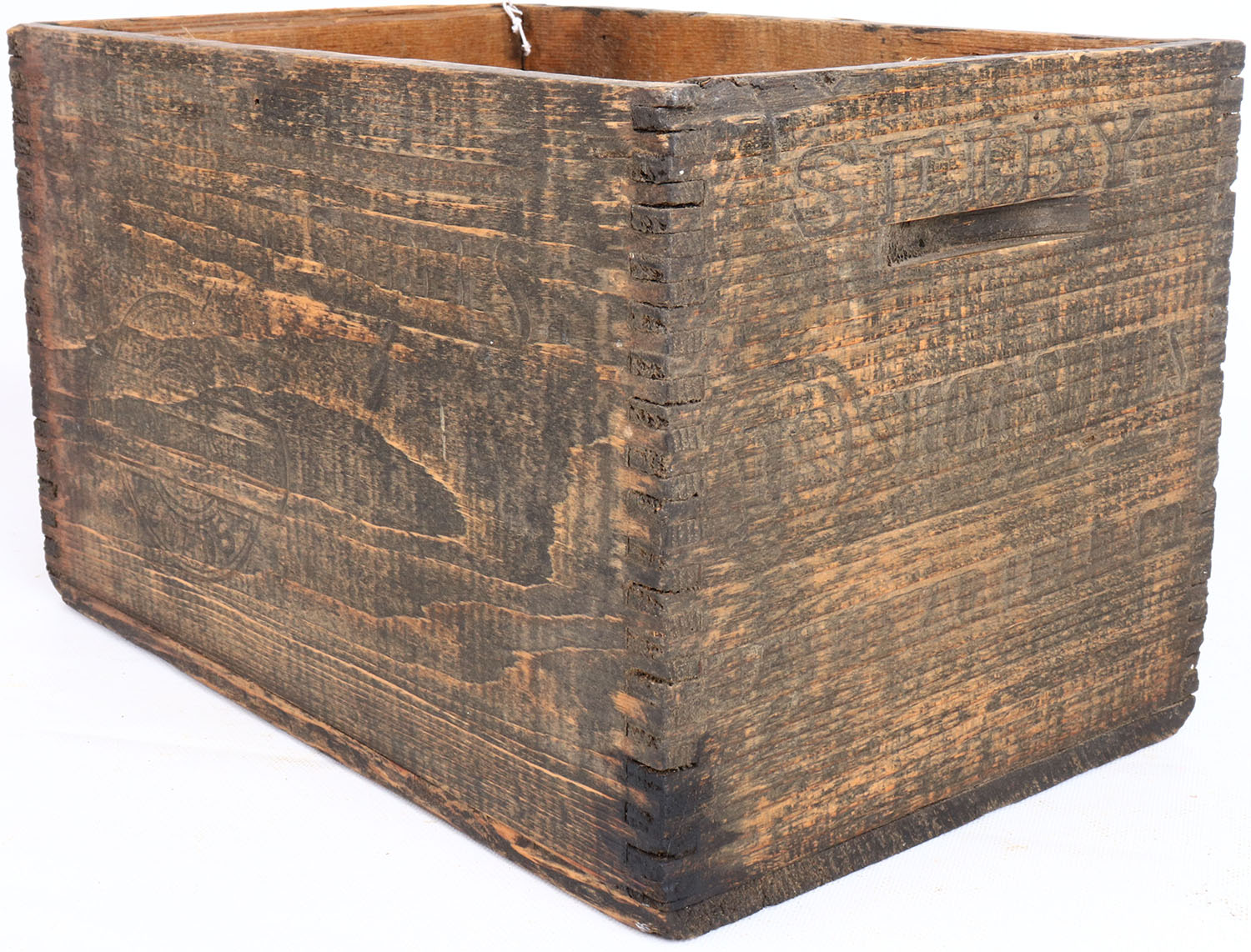 SELBY US THE BLACK SHELLS, tongue and groove construction wood shipping crate, red & black print is barley visible, crate has lots of black coloring. Grade: Good - Value: 10 to 100