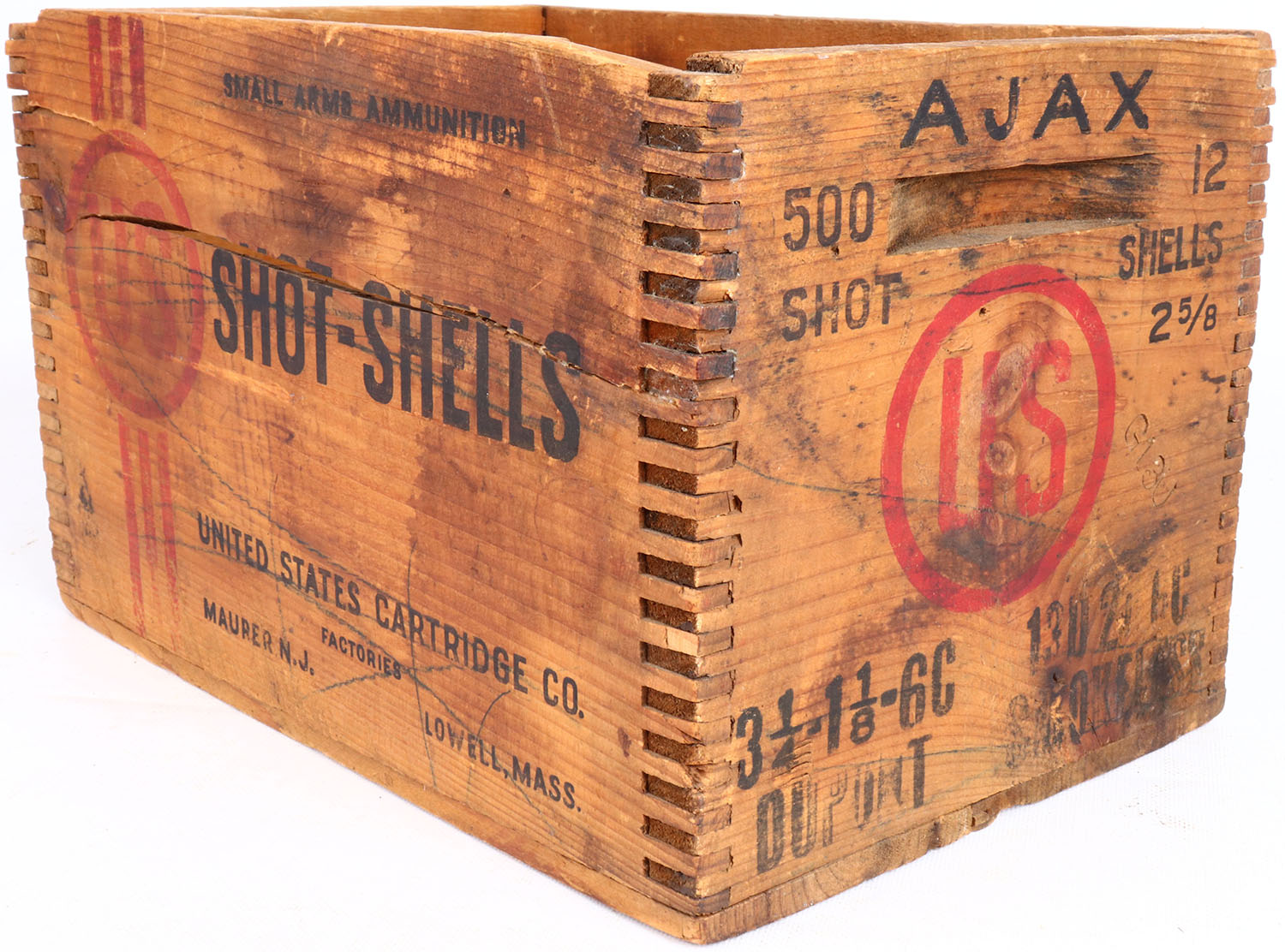 US, AJAX, tongue and groove construction wood shipping crate, red & black print is solid, crate has age soiling. Grade: Very Good ++ - Value: 16 to 60