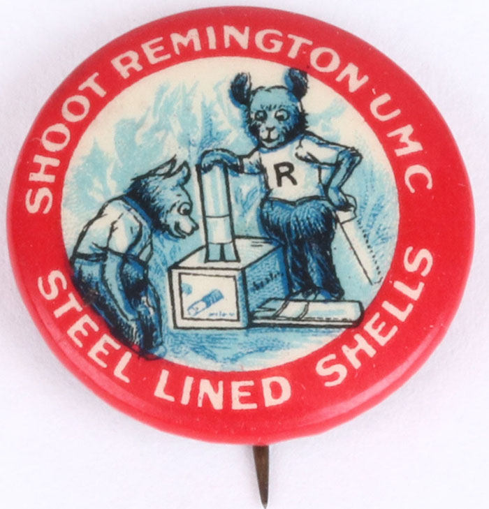 ULTRA RARE! Remington pinback, pictures 2 bears playing with ammo box, Bastian Bros paperback is solid, pin is solid, bright and clean. Grade: Excellent ++ - Value: 100 to 300