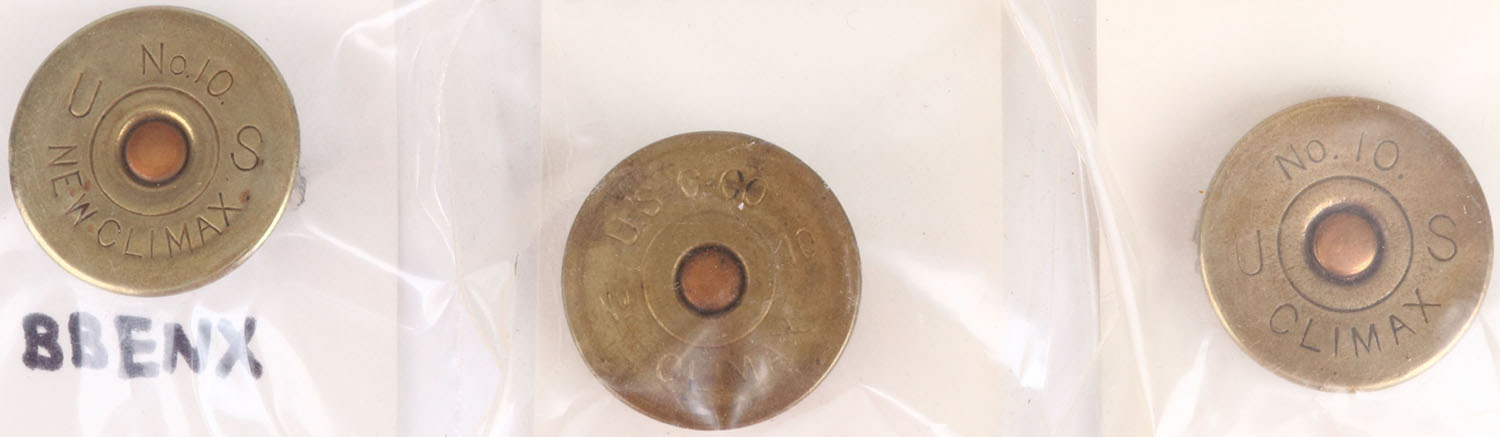 Lot of 3 pinbacks, US shotshell headstamps. Grade: Excellent - Value: 10 to 40