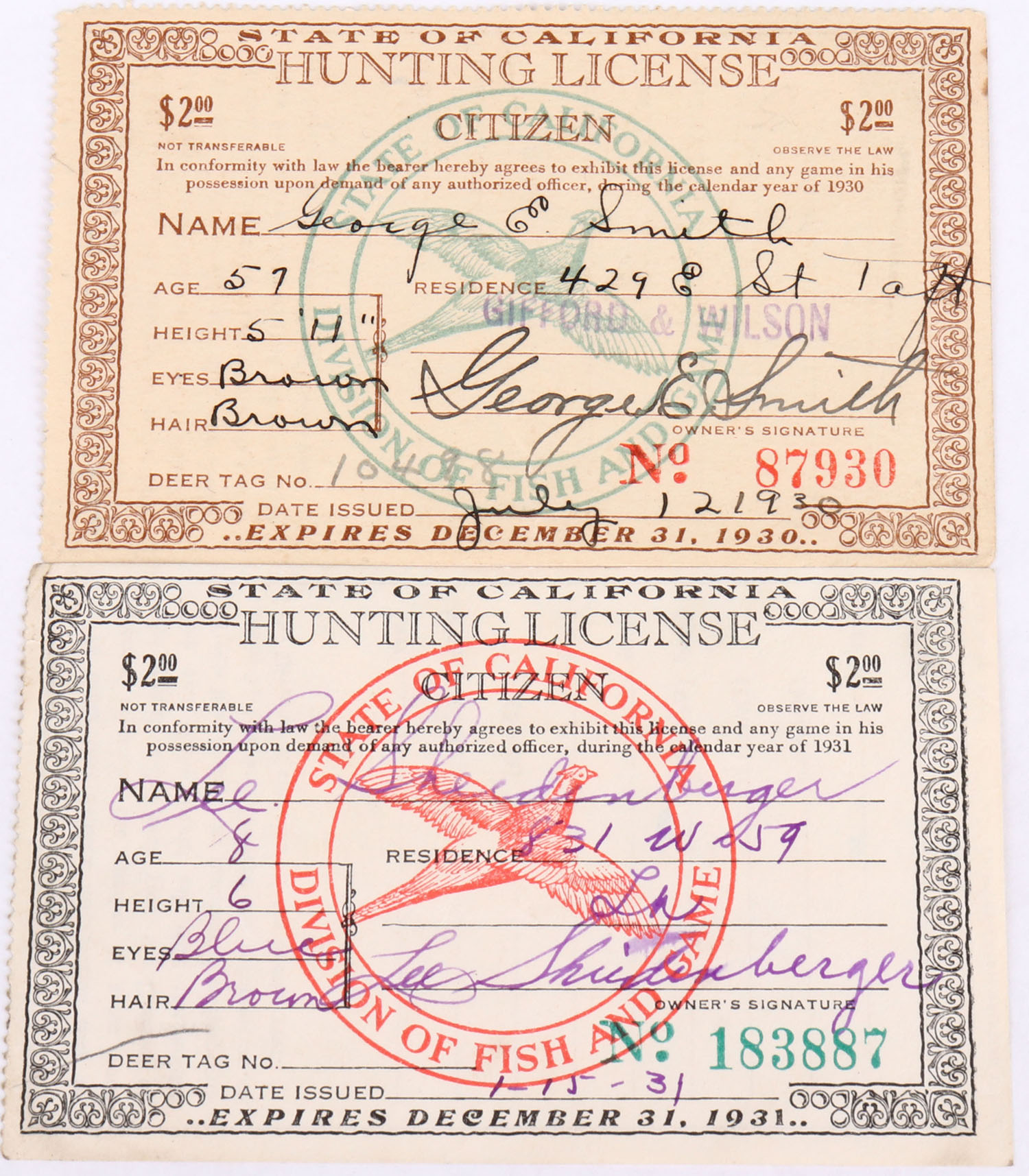 Lot of 2 RARE and EARLY California Hunting License, 1930 and 1931. Grade: Excellent - Value: 30 to 90