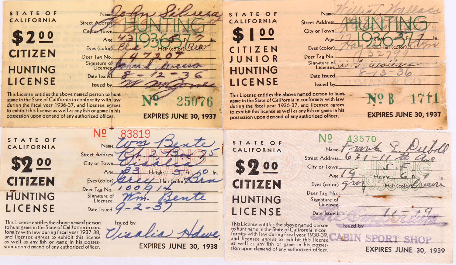 Lot of 4 California Hunting License, 1937(2), 1938 and 1939. Grade: Excellent - Value: 10 to 50