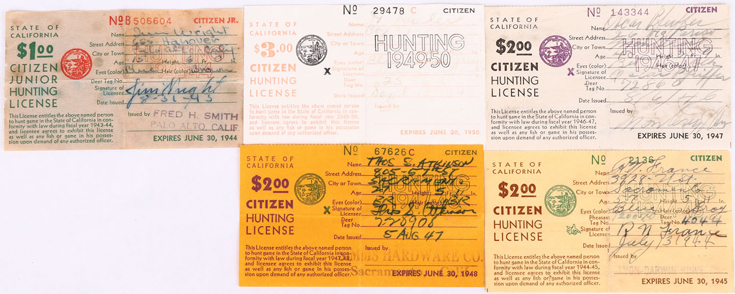 Lot of 5 California Hunting License, 1944, 1945, 1947, 1948 and 1950. Grade: Excellent - Value: 10 to 50