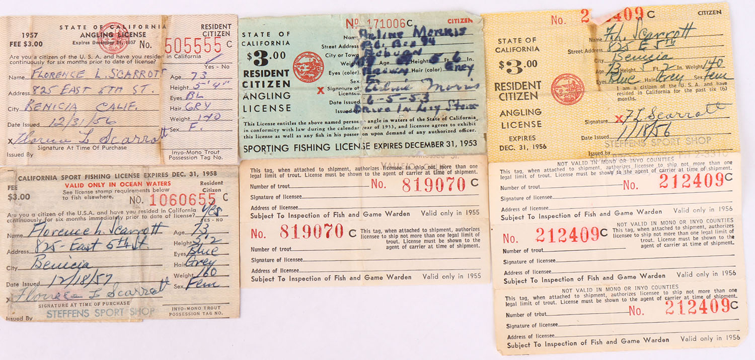 Lot of 5 California Fishing License, 1953, 1955, 1957, 1956 and 1958. Grade: Excellent - Value: 10 to 50