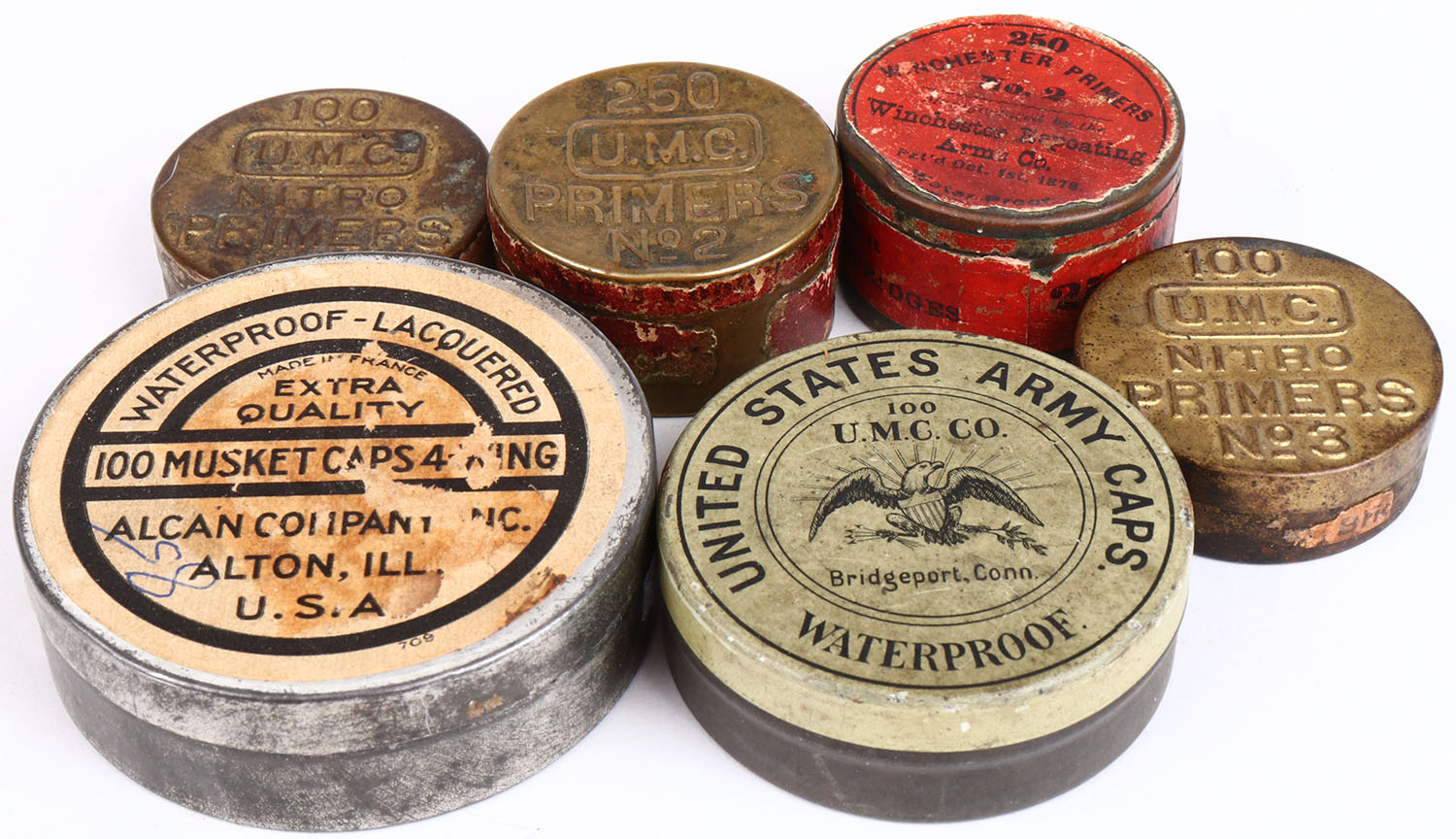 Lot of 6 percussion cap and primer tins, all Partial, has some age soiling. Grade: Very Good ++ - Value: 6 to 60