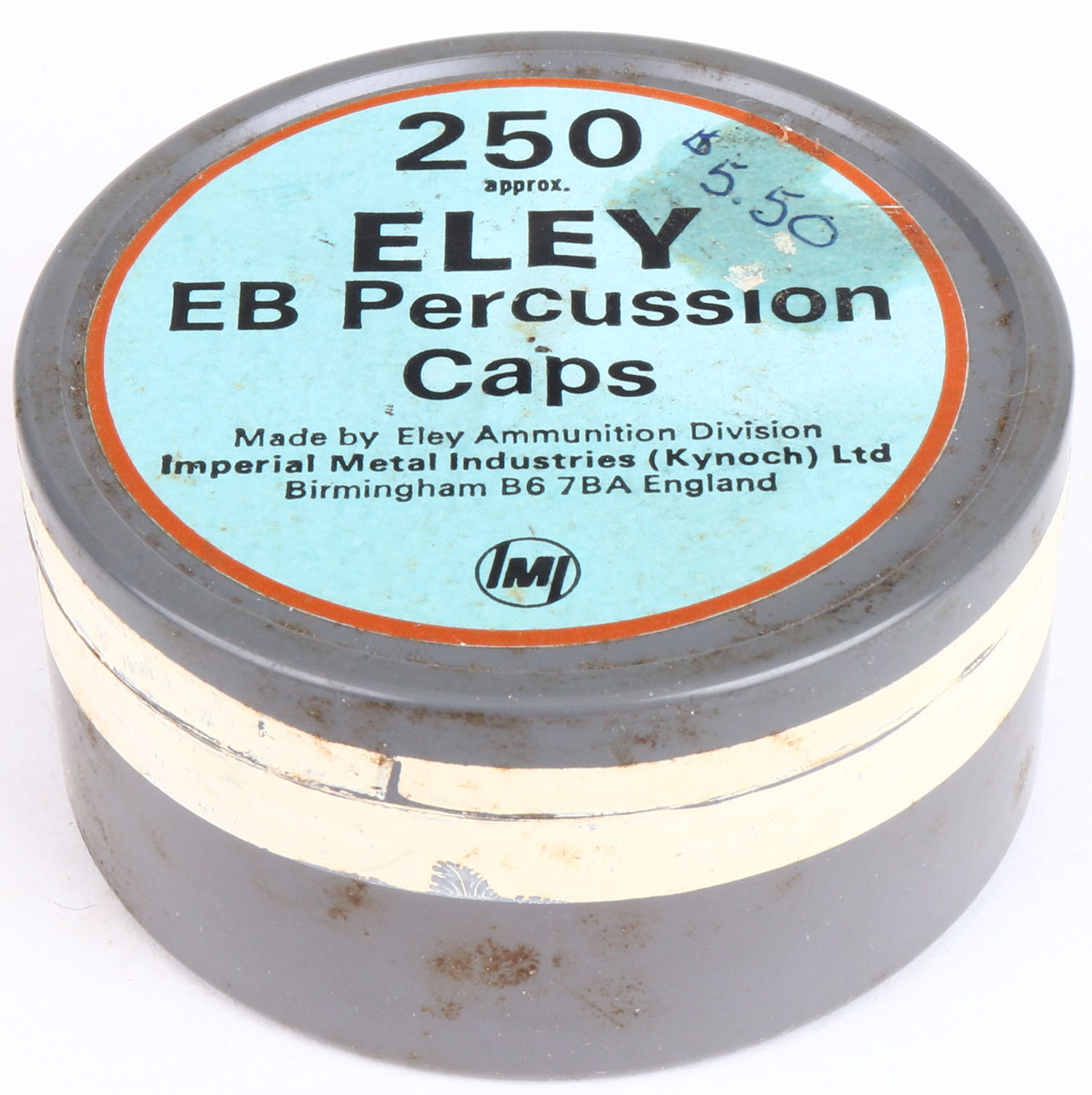 ELEY EB percussion cap and primer tins, appears Full, has some age soiling. Grade: Very Good ++ - Value: 6 to 60