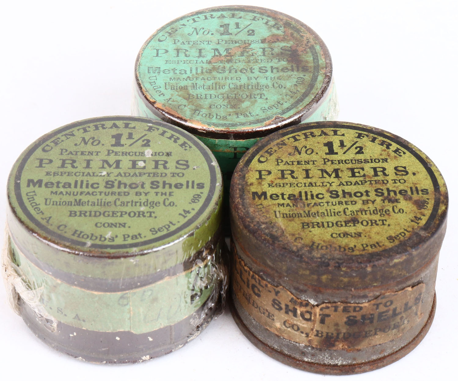 Lot of 3 UMC logo primer tins, all Partial, some scuffing, still solid. Grade: Very Good - Value: 6 to 60