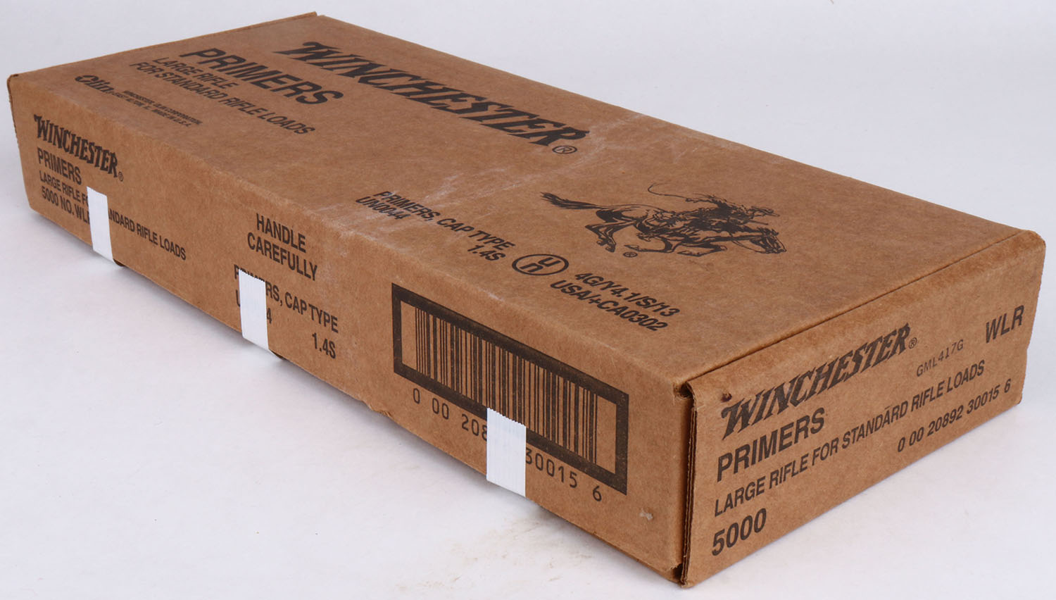 Winchester primer case, FULL, large rifle primers, 5000 in the brick, all bright and clean. Grade: Excellent ++ - Value: 50 to 500