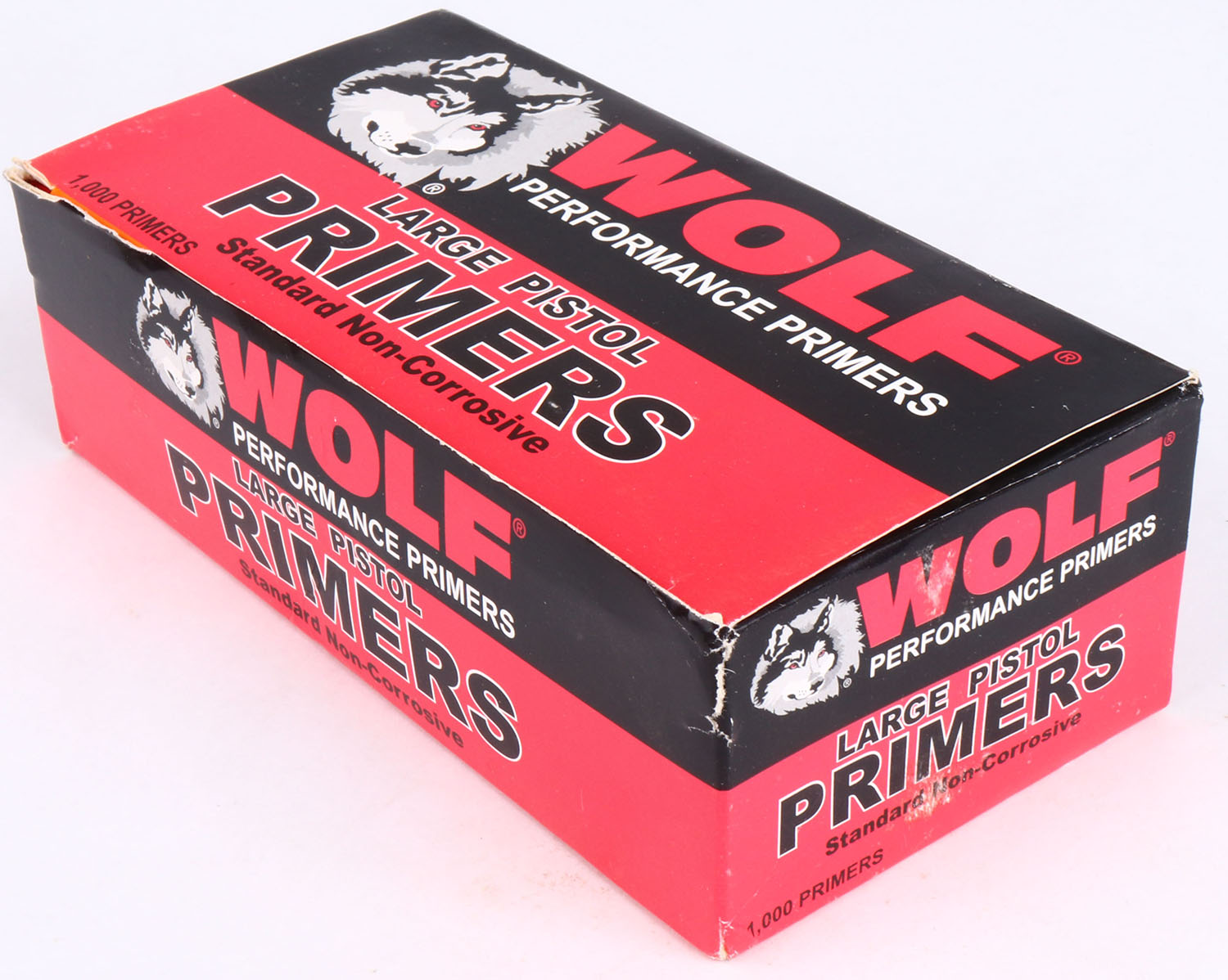 WOLF primer brick, FULL, Large pistol primers, 1000 in the brick, all bright and clean. Grade: Excellent ++ - Value: 20 to 200