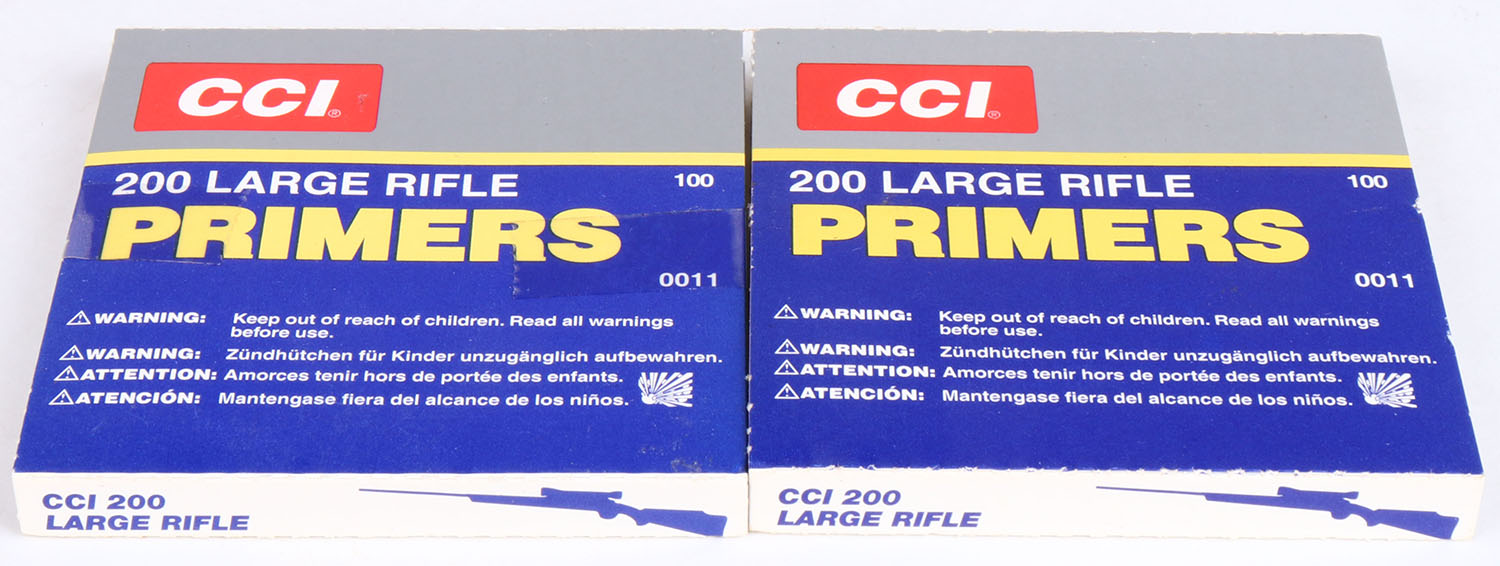 Lot of 2 CCI Large Rifle primer boxes, all FULL. Grade: Very Good ++ - Value: 6 to 50