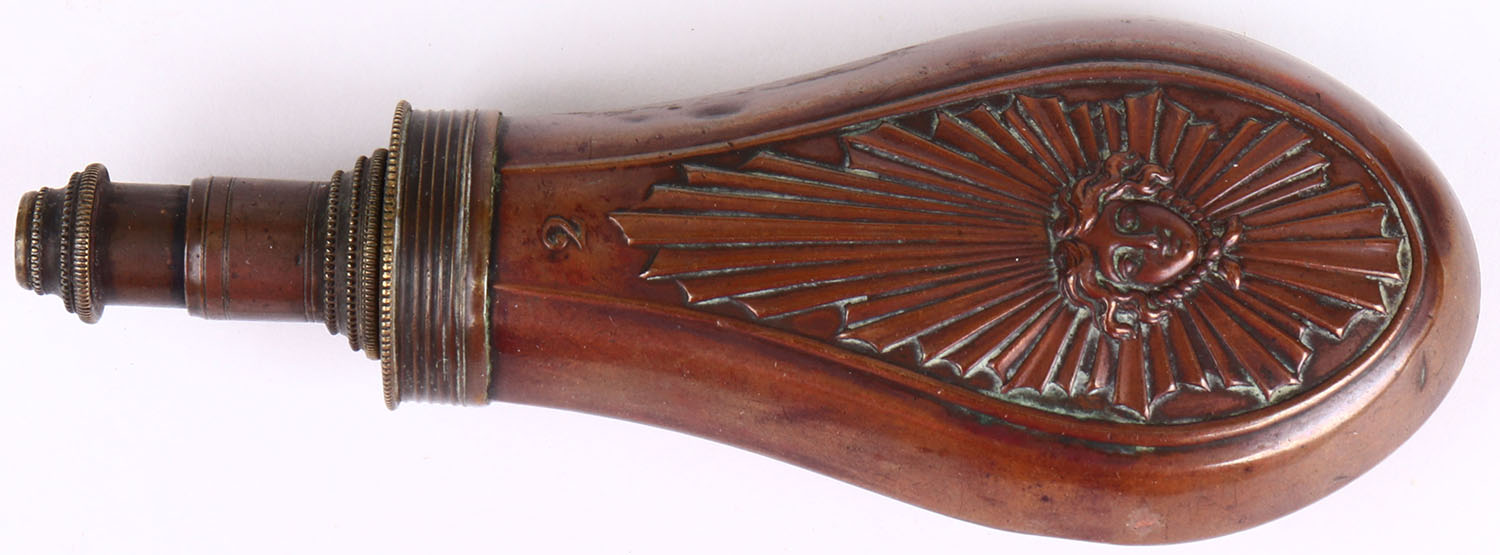 Small Brass powder flask, beautiful design. Grade: Excellent - Value: 20 to 80