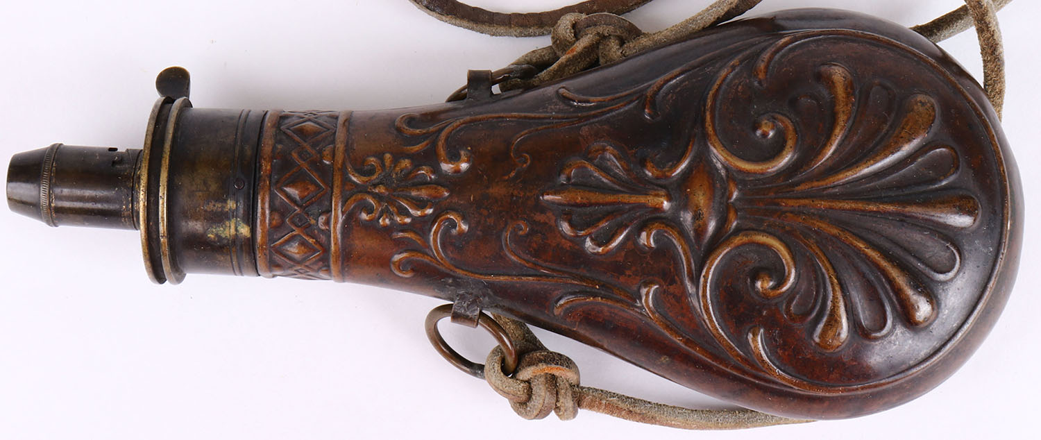 Small Brass powder flask, beautiful design, some age soiling. Grade: Very Good ++ - Value: 20 to 80