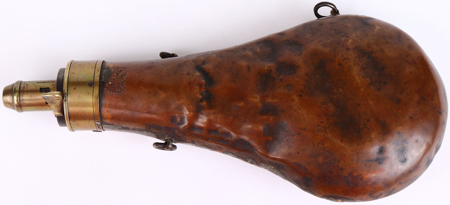 James Dixon & Sons Brass powder flask, has dents and repair to one side and age soiling. Grade: Very Good - Value: 30 to 150