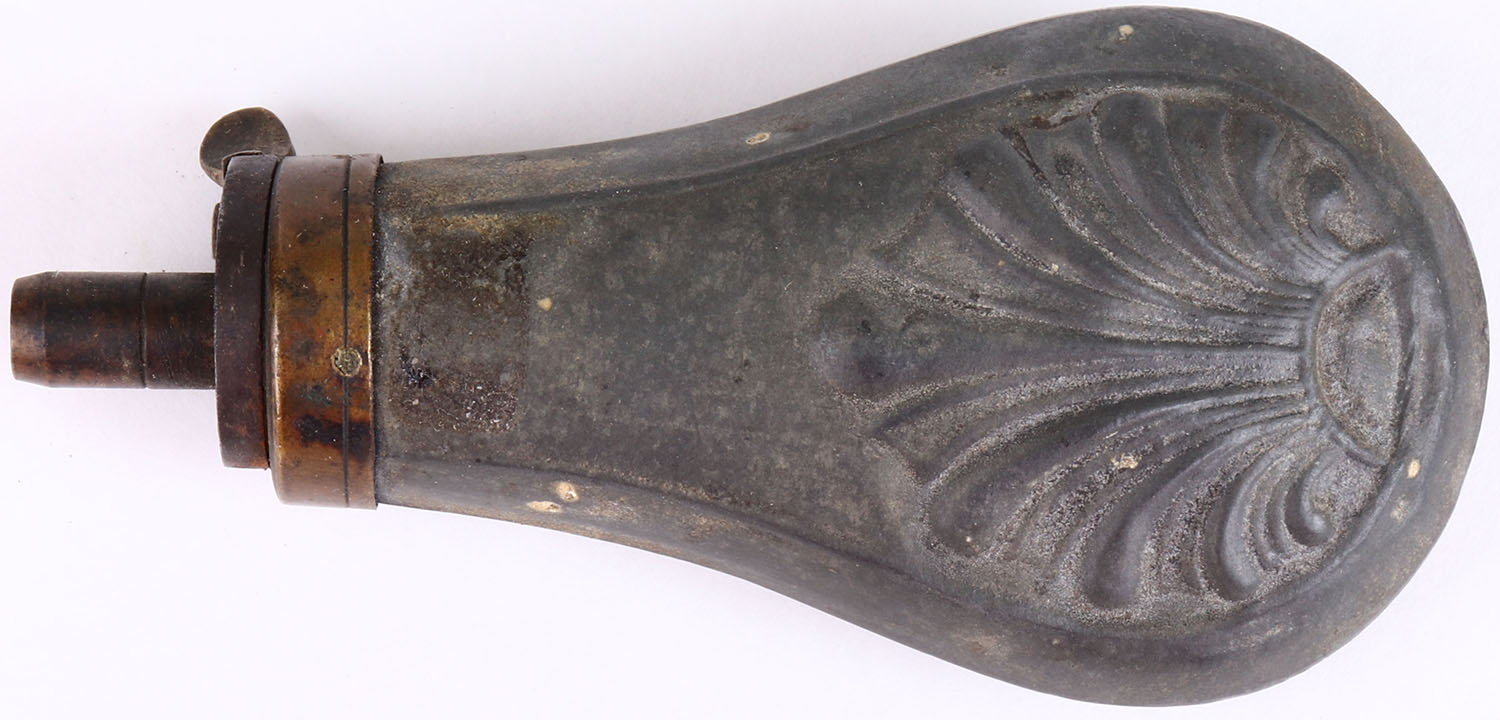 Small Unmarked Brass powder flask, has beautiful design, has age soiling. Grade: Very Good - Value: 16 to 60