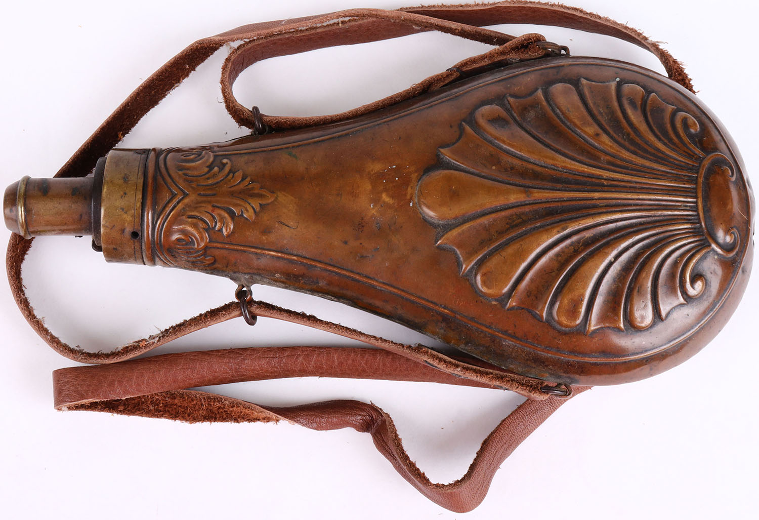 Large Brass powder flask, beautiful design, has some light age soiling. Grade: Very Good - Value: 20 to 80
