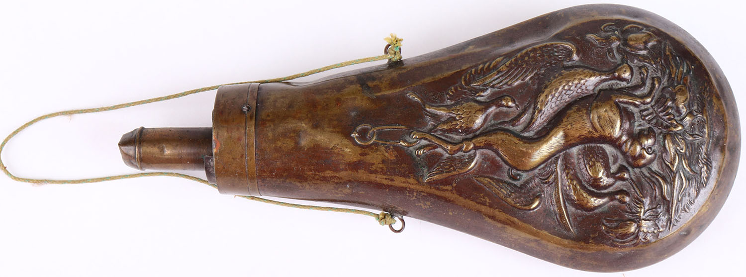 Brass powder flask, beautiful design, has dents and age soiling. Grade: Very Good - Value: 16 to 60