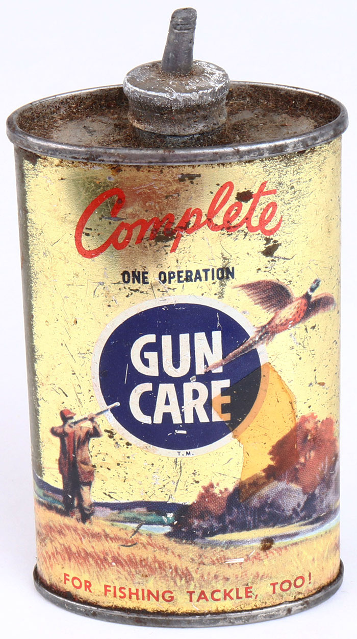 RARE! Complete Gun Care oil tin, Empty, great color with some age soiling, tin spout and no cap. Grade: Very Good + - Value: 150 to 600