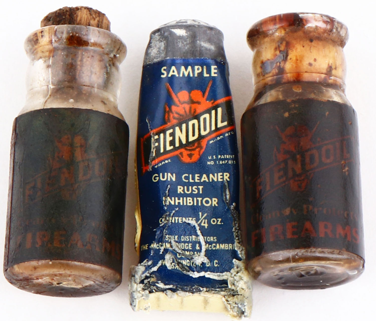 RARE! Lot of 3 Small Fiendoil Oil glass jars and 1 tube, maybe salesman samples, glass jars are empty and tube is slightly used, some soiling but all still solid! Grade: Very Good ++ - Value: 10 to 50