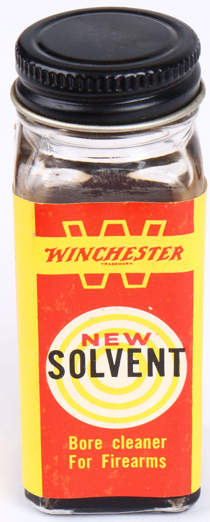 Winchester New Solvent, glass jar with screw on cap, Partial, glass jar and label are solid. Grade: Excellent - Value: 6 to 60