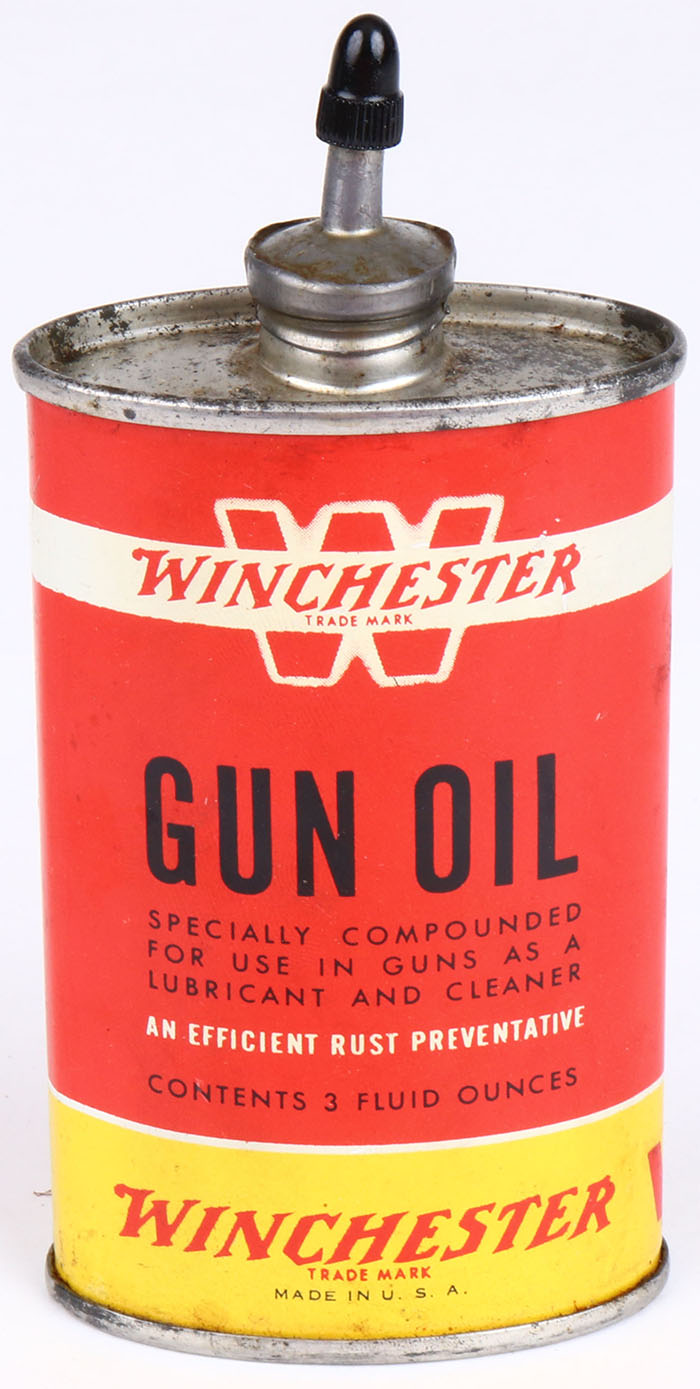 Winchester Oil Tin, Gun Oil, Partial, lead spout & plastic cap, al solid and clean. Grade: Very Good ++ - Value: 16 to 60